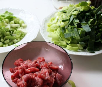 1、先將大蔥切成斜片、香菜洗凈后切成約3厘米上的短備用;
