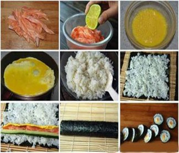 接著將蛋打散后,加少許鹽調(diào)味,放入平底鍋中煎成蛋皮后切作長條。趁油鍋還熱把紫菜包飯切成條的火腿炒一炒,一定要注意火候不要焦也不要不熟。一切準(zhǔn)備就緒,開始包,拿出兩張紫菜細(xì)細(xì)鋪好,米飯倒在上面倒上四分之三。用手弄散鋪滿紫菜的四分之三的每個角落,不要太用力把米飯壓得扁。(然后按順序放上雞蛋條、火腿條、菠菜,最后是腌蘿卜)