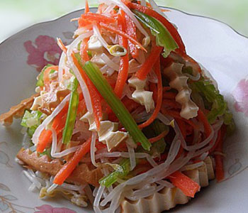 (11)切好的香干條擺放在放入碗中的蔬菜上;