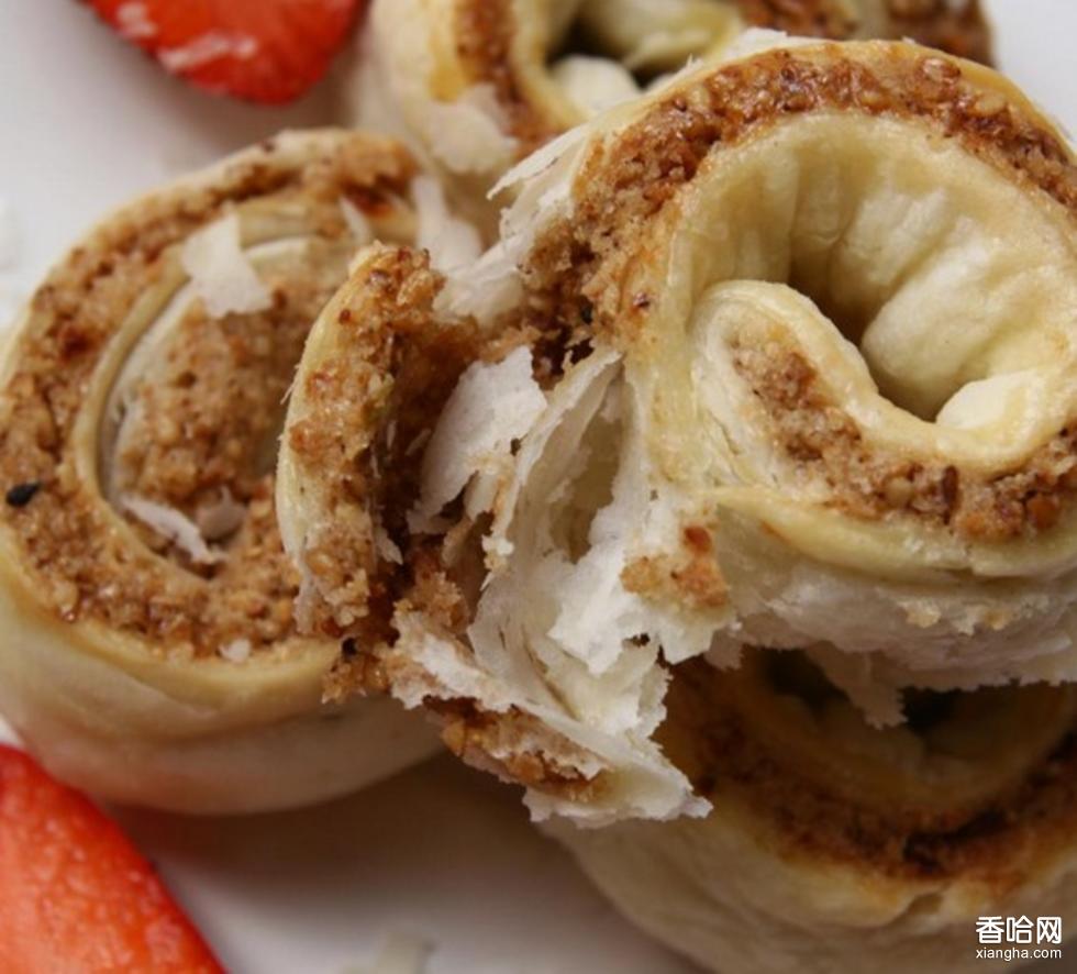 4.成型:包酥、破酥后,包餡并封嚴(yán)劑口,用雙手搓成長條狀,再搟成長15厘米、寬35厘米左右的橢圓形,一端略厚。中間順刀切開,在薄的一端刷水,以搟面杖為軸,將兩條從厚的一端同時卷起,刀口保持平面,抽出搟面杖,規(guī)格選型,按一定間距碼入烤盤。