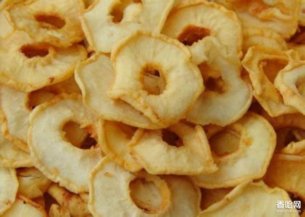 6.成型:將干燥后的梨,用水洗一次;再用硬木搟面杖,在石板上將梨搟成扁圓形,象葉片一樣,就成為梨干了。