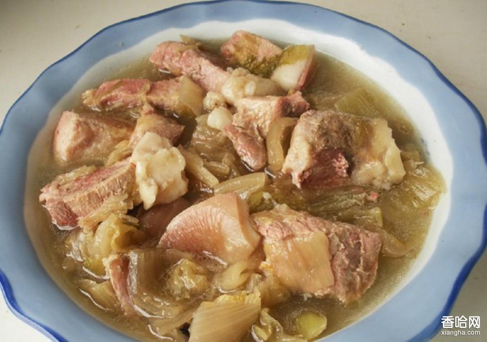 將腌漬后的中等顆咸白菜切成塊狀,將帶皮的五花三層的豬肉切成方寸形,一同放入鐵鍋內(nèi),加以蔥、姜、鹽等佐料,用文火慢燉,經(jīng)過兩小時(shí),方可食用。燉好了的喇嘛肉,表面一層滾動(dòng)的油花,大塊豬肉在菜中裸露,一種誘人解饞的情緒頓然而生。