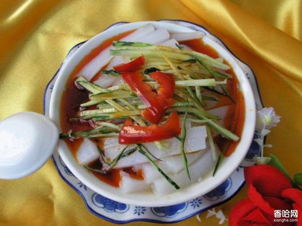 制作分為投料、熬制、成型三道工序。成型后用刀片將粉漏成絲條,放入碗內(nèi),根據(jù)個(gè)人口味酌量加入各種調(diào)料,拌勻即可食,滑潤(rùn)爽口,清涼解暑
