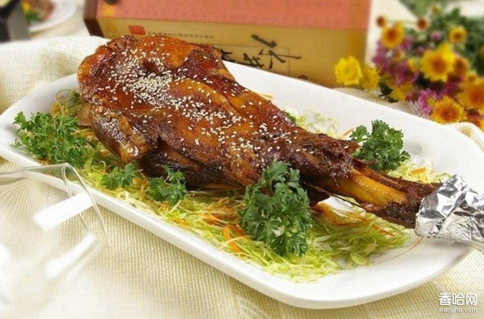 此菜以羊腿為主料,經(jīng)腌制再加調(diào)料烘烤而成。成菜羊腿形整,顏色紅潤(rùn),酥爛醇香,滋味鮮美,回味悠長(zhǎng)。