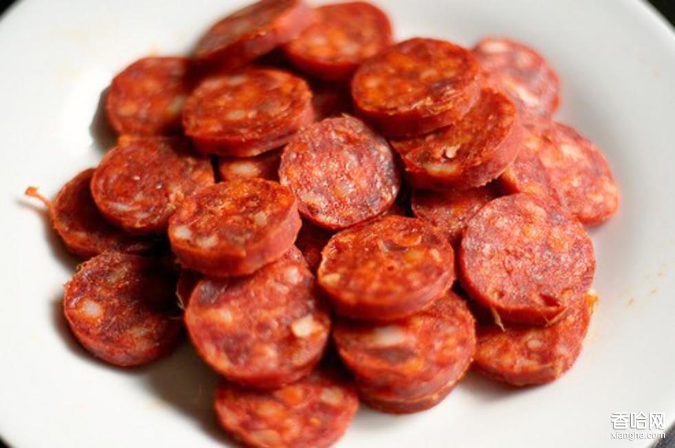 原料配方:新鮮豬肉(精肉占50%以上)100千克精鹽3.5千克亞硝50克白糖5千克紹興酒10千克香油4千克五香面(用白籽、豆蔻、陳皮、肉桂、山柰、丁香、砂仁、花椒、大料等配制而成)500克 制作方法: 1.把精肉和肥肉按比例切成小塊,用絞肉機絞成肉末,加入調(diào)料,用力攪拌均勻,制成肉餡,并稍加腌制。 2.腌制好后,用漏斗把肉餡灌入整理好的腸衣中,用針扎一些孔,排除腸中的空氣,用麻繩打結(jié)扎成小段,放在陽光下曝曬至半干,懸掛在竹竿上,置于通風處晾掛,20天左右,取下進行蒸制。 3.將曬干的小香腸放入蒸鍋內(nèi)蒸制,大約30分鐘后,取出冷卻即為成品。 4.貯存小香腸時要采用懸掛的形式進行,場地要干燥,溫度較低,防止日曬,可貯存1年多,其質(zhì)不變。