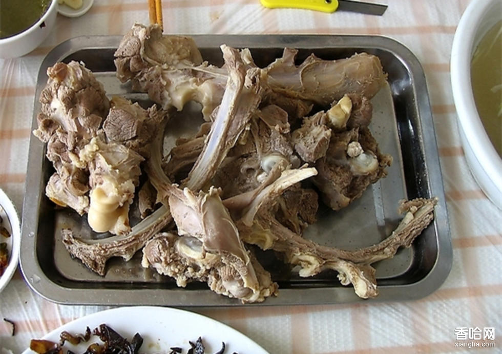 顧名思義就是手抓羊肉。把帶骨的羊肉按骨節(jié)拆開,放在大鍋里不加鹽和其它調(diào)料,用原汁煮熟。吃時一手抓羊骨,一手拿蒙古刀剔著吃??腿瞬灰约簞邮蛛S意選食,主人會視客人的年齡,選擇不同部位的羊肉。
