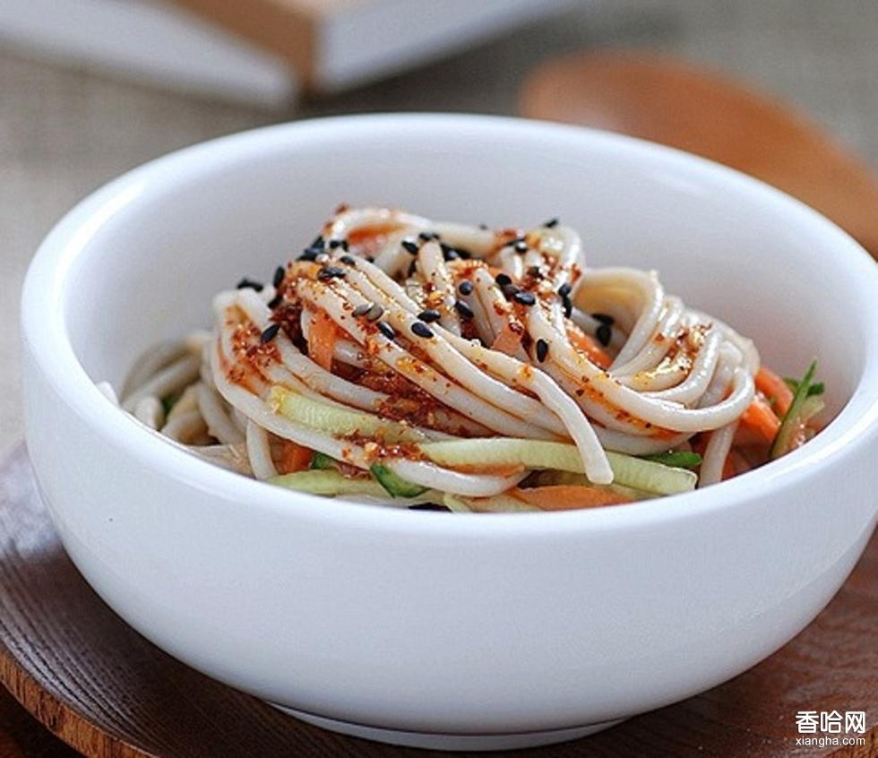用蕎麥仁加水滲透碾壓,漸漸加水,摻成糊狀,過濾去渣,稠度以掛勺為宜。而后將粉糊盛碗入籠,旺火蒸熟后晾涼,從碗中脫出成,故名碗砣。其色淺灰,食時(shí)切片,狀若柳葉。調(diào)拌湯汁用鹽、醋、油潑辣子、花椒粉、姜粉、蒜泥、香菜、芝麻等加水勾兌而成。