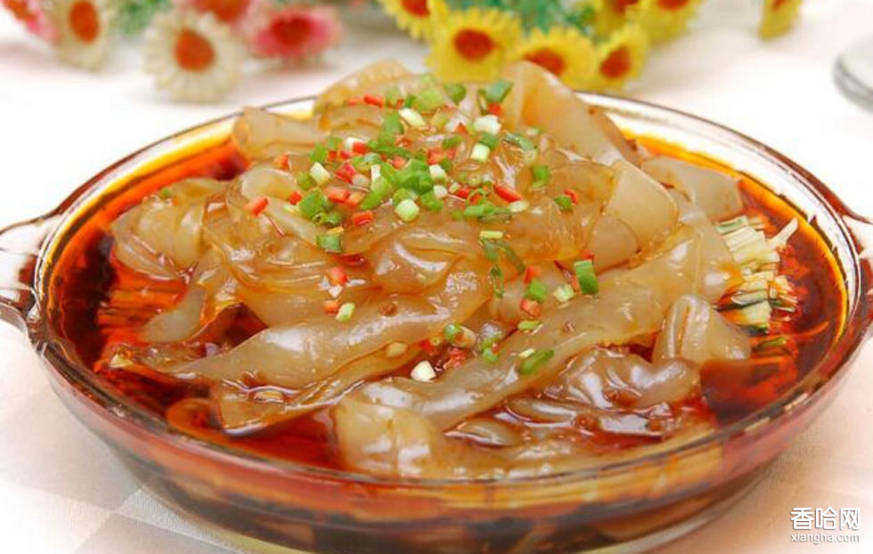 4、吃法:將涼粉’打‘成塊狀,加以醋,水,辣椒油,香菜,豆腐干,蒜,蔥等。