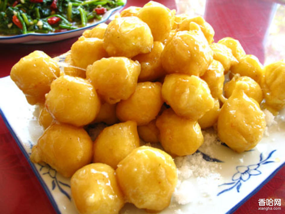內(nèi)蒙古風(fēng)味名菜。以奶豆腐為主料烹制而成。特奶豆腐切條、裹面粉、掛上用雞蛋清、淀粉、面粉制成的松糊入油鍋炸熟,呈金黃色撈出。鍋內(nèi)加適量白糖熬成拔絲糖漿,倒入炸好的奶豆腐,并撒些芝麻,裹勻糖漿裝盤(pán)即可食用。此菜色澤金黃,口味甜香,上席牽絲不斷,是酒席中的上等佳品。