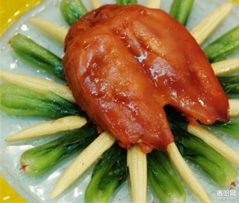 駝?wù)萍瘩勌悖托苷埔粯佣际钦滟F的美味。早在漢代就有“駝蹄羹”,并成為歷代宮廷名菜。明《本草綱目》載:“家駝峰、蹄最精,人多煮熟糟食?!痹趯幭暮透拭C地區(qū)都喜食用駝蹄。扒駝?wù)朴民務(wù)坪碗u、鴨蒸、燒而成。成菜色澤深紅,駝?wù)栖洜€筋糯,鮮味濃厚。