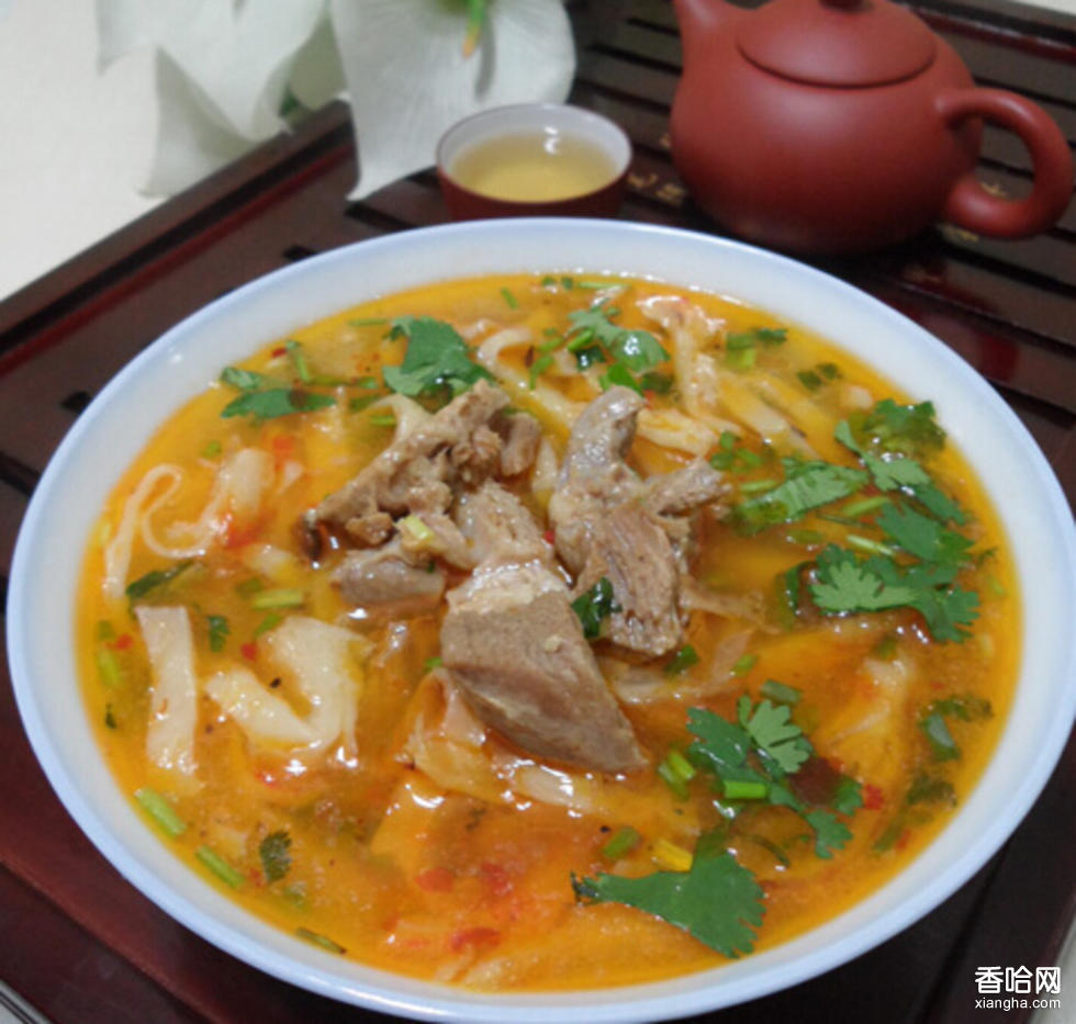 羊肉胡卜”不是羊肉和胡蘿卜,這里的“胡卜”指的是一種死面餅子,是山西運(yùn)城地區(qū)的久負(fù)盛名的特色小吃,尤以北相鎮(zhèn)的最為著名,故稱“北相羊肉胡卜”,距今100多年歷史。它的做法是:把烙熟的白面薄餅切成絲條狀,加鮮羊肉湯煮燴,再調(diào)以香油、蔥花、辣椒等調(diào)料。吃起來清爽可口,油而不膩,極富營養(yǎng),因而遠(yuǎn)近聞名,是運(yùn)城人一年四季離不了的美味。