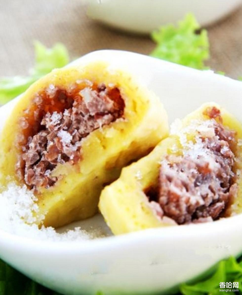 制法:將大黃米、大米洗凈,侵泡12小時,磨乘粉漿放入布袋將水壓干,將粉團加水和成稍硬的面團,下成30g一個的劑子,逐個包入10g豆沙餡,搓成門丁形,以12個為一組上屜蒸12分鐘即熟。