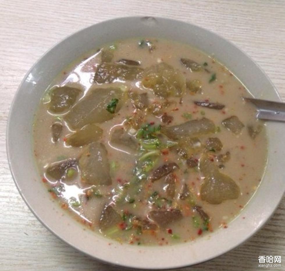 3、鮮豬血澄清,上部血清加1/4清水、鹽、味精及用砂仁、桂皮、企邊桂、紫蔻、丁香合制的調(diào)料面攪勻,倒入豬腸中,扎緊封口,下開水鍋用小火煮至浮出,撈出晾涼切片,下水鍋中焯透撈如湯碗只,加蔥花、 姜絲、味精等調(diào)料及肉湯,隨白肉一同上桌即可。