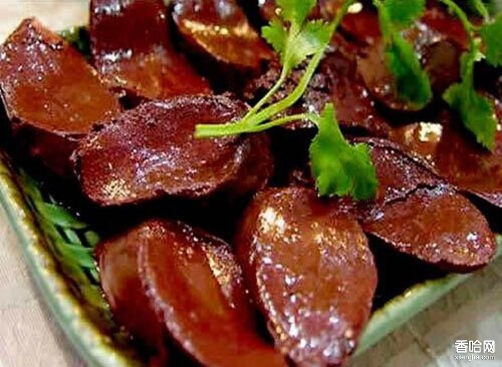 豬灌腸,也稱香腸,用豬血、豬腸做制。把宰豬時(shí)的鮮豬血接下,加入蔥花、蕎面、調(diào)料,攪和成糊狀,灌人洗凈的豬腸內(nèi)蒸熟即成,食用或熱或炒,民間多在過春節(jié)時(shí)做豬灌腸。