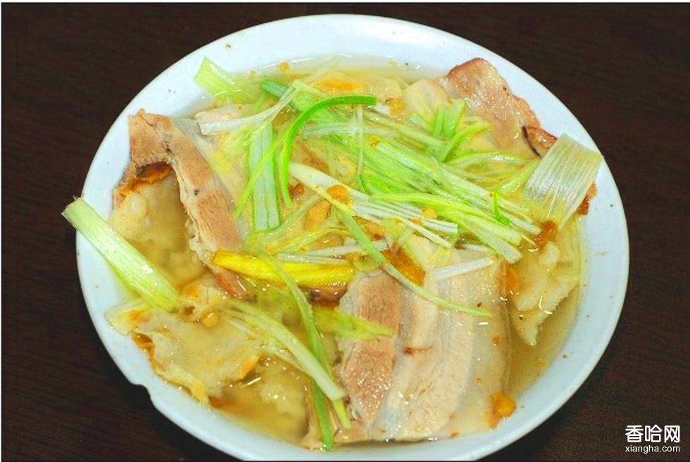 4.火燒外脆里嫩,撕開(kāi)后層層疊疊,把火燒按層撕成云彩片,將煮熟軟的肉切成薄片,把大蔥切成段,盛在碗內(nèi),用開(kāi)鍋頭湯將火燒澆數(shù)次,必須罩透,略盛少量湯汁即可。