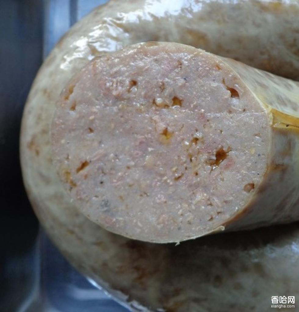 系以新鮮豬大腿肉、肋肉、臀部肉、腰肉為主料,大多為瘦肉;腸衣為漂洗潔凈無暇的豬腸衣;輔料有石落子、砂仁、香精、精鹽、砂糖、純高梁酒及陳年醬油等。先將肉料洗凈去血,切成肉丁,加以各種佐料及調(diào)料,攪拌均勻,放置3小時左右,待料味入肉后再灌腸。每灌14厘米左右用麻繩結(jié)扎,邊灌邊扎,直至整條腸衣灌滿,然后經(jīng)恒溫烘干而制成。