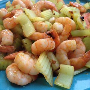 材料:水芹菜、紅辣椒、蝦、油、鹽、醬油、料酒、淀粉、蒜、生姜。