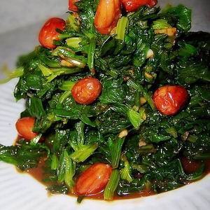 材料:嫩的芹菜葉、辣椒油、香油、鹽、蒜。