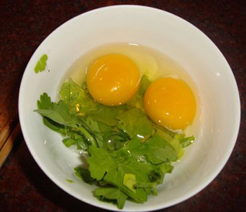 2、打三到五個雞蛋進去,結(jié)合芹菜葉子攪拌均勻。