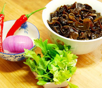 材料:芹菜葉,黑木耳,白芝麻(熟),鹽,花椒油,香油。