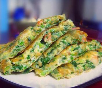 4、炒鍋?zhàn)⒂蜔裏幔瑢嚢杈鶆虻碾u蛋糊倒進(jìn)去,攤成餅狀,一面熟了后,再翻過(guò)來(lái)煎熟。