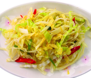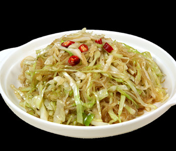 3、倒入卷心菜絲,煸透后調(diào)味,炒熟即可食用。