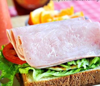 (5)再在煎蛋上面蓋一片生菜葉,上面碼放切好的西紅柿片,最后把火腿片碼在最上面,吃的時候蓋一片吐司片;
