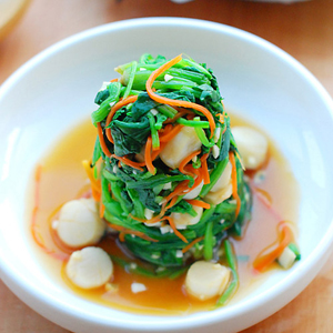 材料:扇貝適量,菠菜適量,胡蘿卜適量,大蒜適量,鹽適量,味極鮮適量,糖少許,米醋適量,花椒油適量