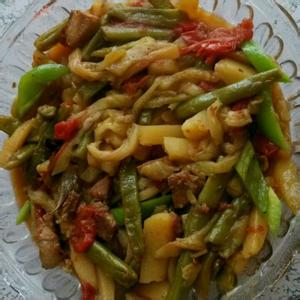 放入茄子丁土豆丁一起炒,待茄子稍蔫加入水。