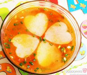 做法:先把鍋中加入一定量的清水,然后切幾片(姜片可根據(jù)個人口味或多或少)帶皮的姜片放入鍋中煮,接著將提前削好皮的土豆切片(土豆片的厚薄沒有關(guān)系),放入鍋中煮,為使土豆能快速煮熟,秘訣就是:要在鍋中加幾滴食用油,在煮土豆的空隙,將洗好的西紅柿切塊備用,把小香蔥切小段備用。土豆煮到5分鐘以后,等到土豆片用小勺一壓就碎時加入西紅柿塊和小香蔥段,大約煮3分鐘,最后加入適量的鹽和雞精,出鍋。