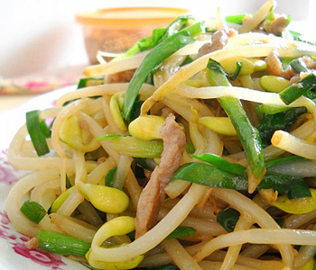 2、豬肉切絲,用淀粉、生抽拌勻;韭菜洗凈、切段;黃豆芽洗凈備用。