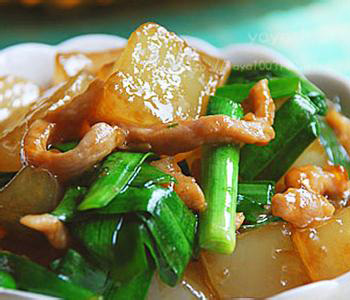 材料:瘦肉、涼粉、韭菜、料酒、鹽、生抽、生粉、油、姜絲、雞精等