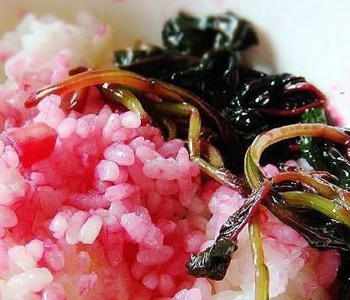 食譜原料:紫莧菜250克,粳米100克,精鹽、味精、豬油各適量