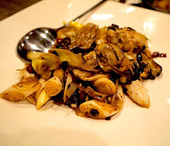 3、將所有的海蠣肉集中一起用調(diào)味料腌制片刻后重新裝在牡蠣殼上(這一步也可以省略,如果你喜歡這種鮮味的話)