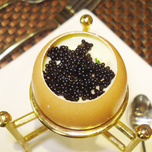 為了完整且單純地品味魚子醬的鮮美,要讓魚子醬和“蔥姜末”“洋蔥末”等雜碎的輔助香料隔離開來;各類中式醬料也是要仔細斟酌后才能與之搭配的,氣味太濃烈的一定要摒棄,若需要醬汁入味的話,西餐“打泡”的手法可以借鑒。