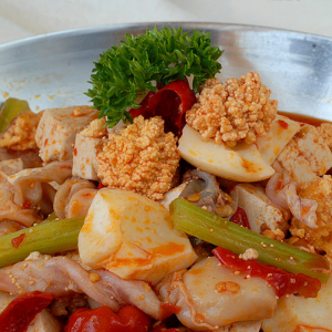 將買回的牛鞭先入清水中浸泡半天,先切成5厘米長的段盛入盆中,加入蔥段、姜片,淋入二鍋頭,入籠旺汽蒸90分鐘后取出,用清水浸泡3小時(shí),待涼透且泡去異味后先縱向切開,然后在兩邊分別打上花刀(約切入4/5)。油菜入沸水中火燙10秒鐘撈出裝入容器中擺好。另起鍋加花生油,燒至六成熱時(shí)放入自制魚籽醬、牛鞭大火翻炒約6秒炒勻出鍋,裝入油菜中間即可。
