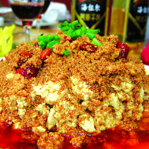 將蒸好的青魚籽碾成末,放入5個(gè)雞蛋,加大蔥末、蝦醬、味精、料酒攪勻。另起鍋加油燒至六成熱,放入做好的原料,大火快炒1分鐘,炒散后淋上香油,裝入盤中,隨盛裝鴨餅的小碟上桌。