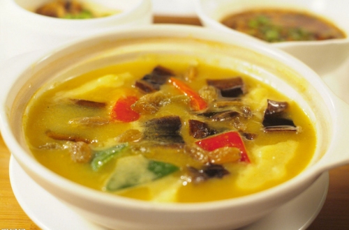 先把黃鱔剝皮開膛洗凈,用熱水去掉黃鱔外皮黏液,準(zhǔn)備好各樣佐料,油燒熱后,先把小蔥、姜片下鍋試油,放入微量鹽、食用糖,接著黃鱔入鍋,加入肉桂、八角等等干料,翻炒約5分鐘,注入開水適量,放入花椒(用紗布扎袋)、枸杞、條參、當(dāng)歸等藥物,大火燉10分鐘,加入蔥段、蒜塊、干辣椒、金針、拳菜、豆筋等等配菜,小火煲30分鐘,加入鹽調(diào)整咸淡,滴少許白酒去除腥膻,放入切好的青椒絲,加入小磨油,裝盤出鍋。