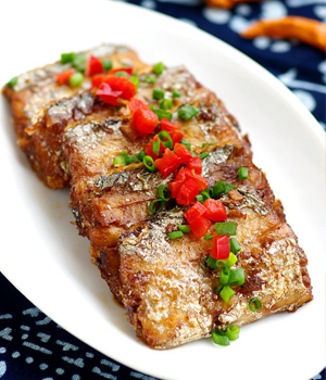 如果大家還是覺得怕上火,那不如就把帶魚做成老媽子帶魚,這道菜的基本材料:精選白帶魚、泡紅椒、番茄沙司、紅油、料酒、姜等。準(zhǔn)備好材料之后,我們先將帶魚清洗切段,加蔥、姜、酒、鹽、味精、醋腌約15分鐘;接著把油燒五成熱,逐塊下帶魚,小火炸至金黃色撈出瀝油;等到燒熱紅油,加入番茄沙司、泡紅椒同炒至色呈鮮紅,加入少許清水燒開至香味溢出時(shí)下炸過的帶魚稍燜入味,至汁稠濃,加少許香油翻炒均勻,最后就可以出鍋了。