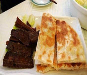 餅胚做好后,餅鐺放在微火上燒熱,先用濕布將餅鐺擦一下試一試熱度,若冒白氣就是太熱,可適當(dāng)降低火力;若一擦即干并不冒白氣,即可將餅放在餅鐺上,先在餅鐺上刷上油,再刷油于餅面,烙兩分鐘后翻過來,再刷上油烙兩分鐘。以后反復(fù)地翻,若油干了隨時(shí)刷些油。前后約烙十分鐘,兩面均呈金黃色時(shí),從餅鐺上取下。放入盤中即可?!?