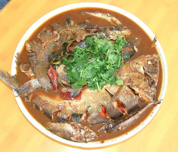 5、就著熱鍋熱油,下豬肉片稍炒,再下蔥段、姜片,出香味后下料酒、醬油、鹽、味精、肉湯和炸好的魚塊。