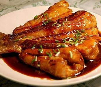 4、在鍋中留下的湯汁中加入少量淀粉,加香油燒至糊狀后倒在盤中的青魚(yú)上,撒上蔥花即可食用。