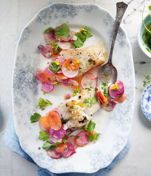 7、鱈魚擺在餐盤里,洋蔥、胡蘿卜片隨意撒在上面,最后撒上一些油麥菜花。