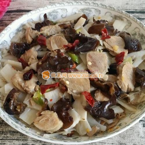 蓮菜(1個(gè)) 熟肉片,木耳,青椒(適量) 蔥姜,干紅椒,花椒粒(適量) 油,鹽,白醋,雞精(適量)