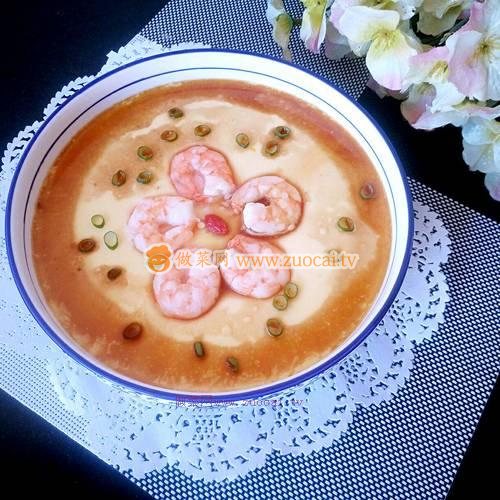 12.小火約蒸15分鐘后,揭開鍋蓋看蛋液已經(jīng)變?yōu)榈S色已微微凝固,將蝦仁小心地?cái)[在基本半凝固蛋液上。