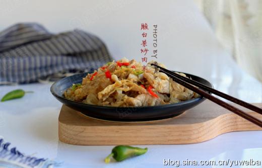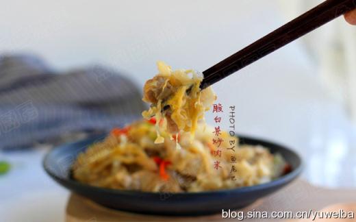 5、豬肉洗干凈切成絲,用油輕輕拌勻。