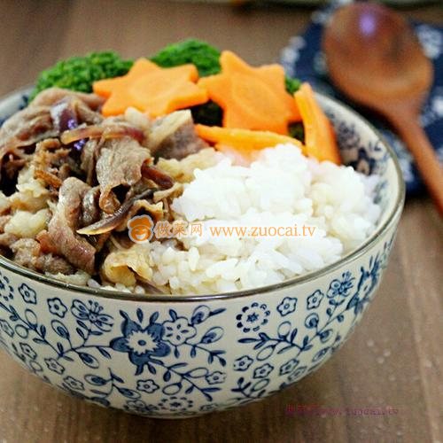 10.碗中盛米飯,把牛肉片洋蔥和蔬菜鋪到米飯上,然后澆上湯汁拌著吃。