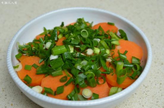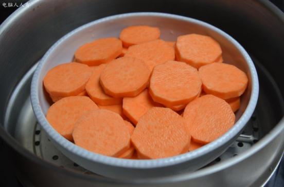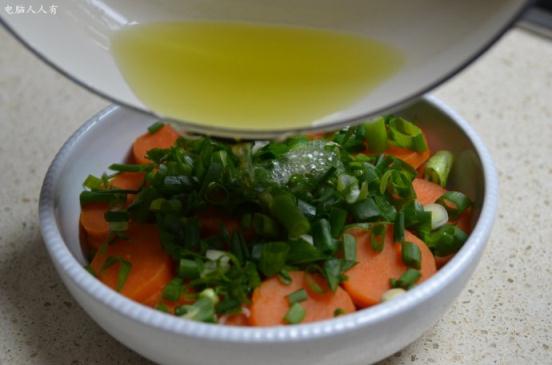 當(dāng)然不蓋膜蒸也行,要將水逼去(此水美味不可丟)。再將蔥洗凈,切成蔥花,均勻地撒在已經(jīng)蒸熟的紅薯上。