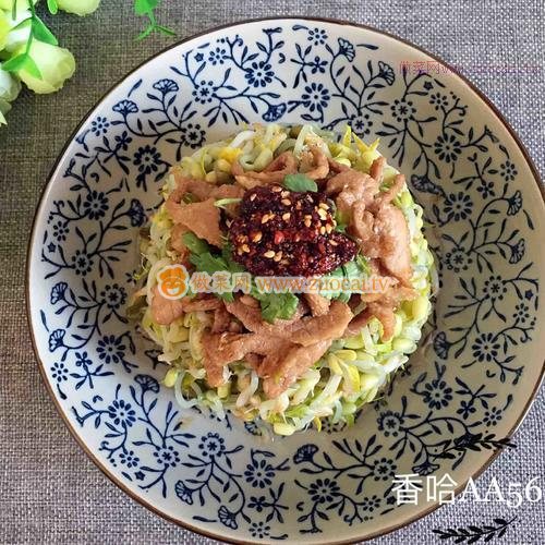 9.肉絲擺放在豆芽上,撒香菜末蒜末。