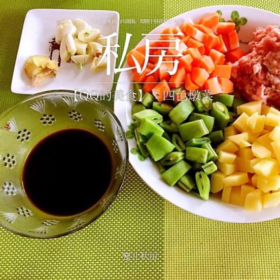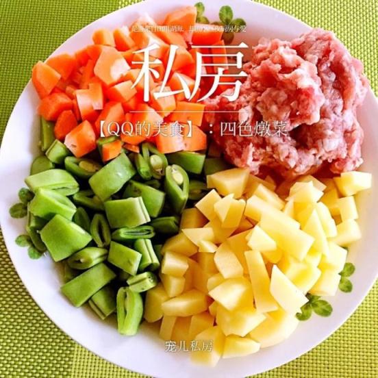 將土豆、扁豆、胡蘿卜統(tǒng)一切成小丁。顏色非常鮮艷滴說